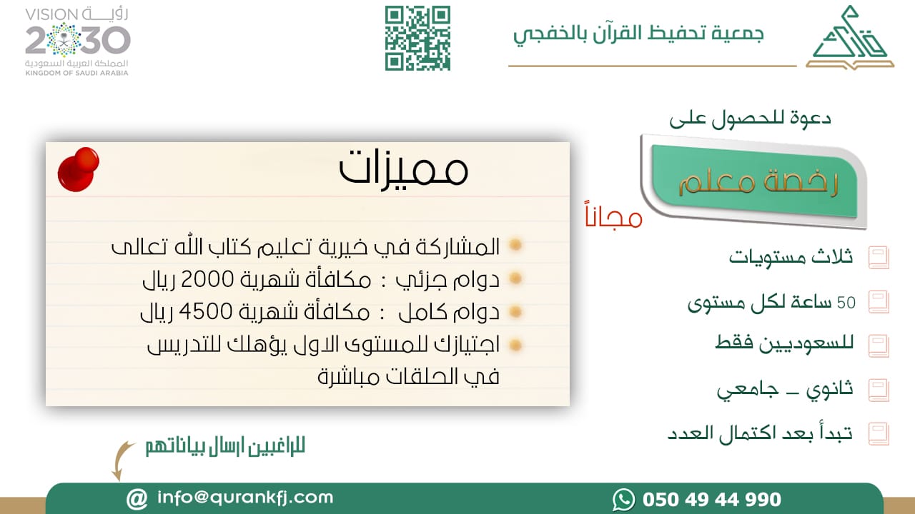 تعلن إدارة الشؤون التعليمية بجمعية قارئ عن حاجتها لمعلمي تحفيظ القرآن الكريم، وتستقبل الجمعية الراغبين في مشاركة خيرية كتاب الله بعد اجتيازهم دورة تأهيلية للحصول على رخصة معلم حلقة، وهي ثلاث مستويات بواقع ٥٠ ساعة تدريبية لكل مستوى، يحق للمتدرب التدريس في الحلقة بعد اجتياز المستوى الأول ، على أن يُكمل المستوى الثاني والثالث تباعا أثناء التدريس .