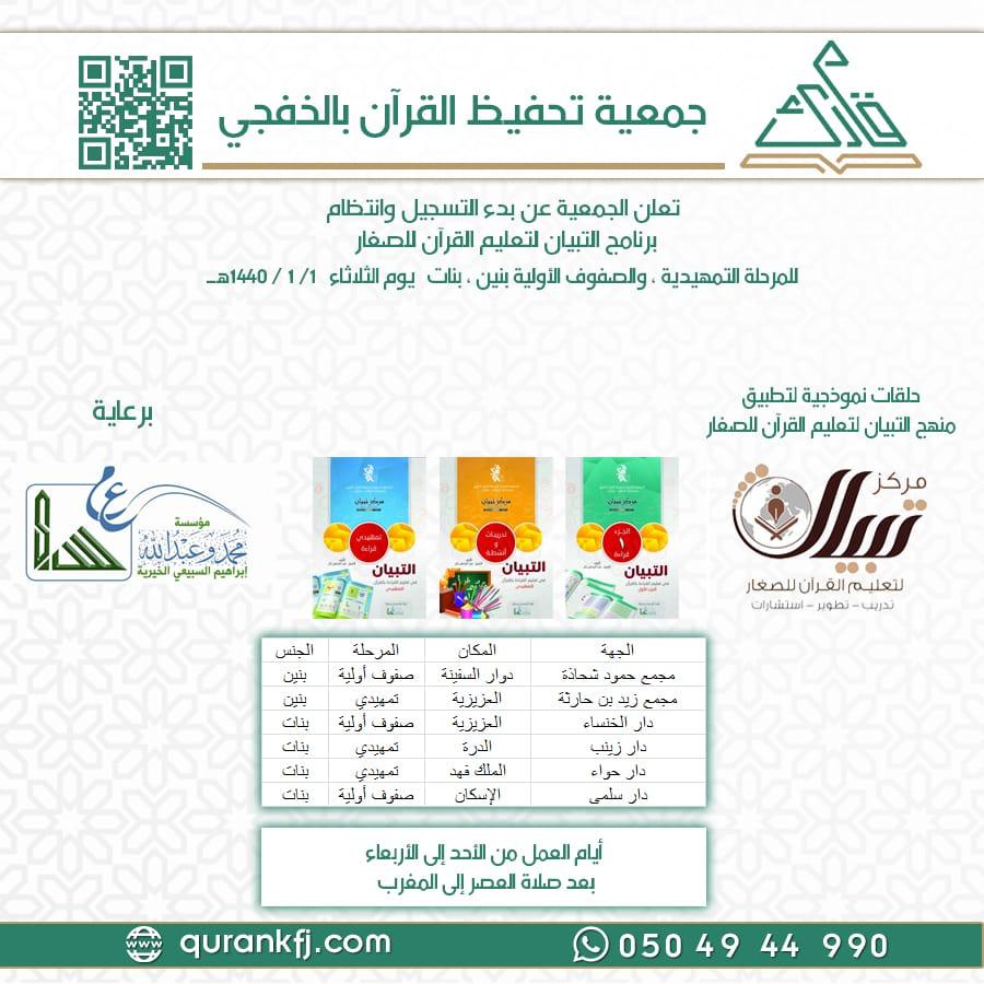 صرح مدير الشئون التعليمية بجمعية تحفيظ القرآن بالخفجي (قارئ) اطلاق برنامج تبيان لتعليم القراءة بالقرآن لطلاب وطالبات التمهيدي والصفوف الأولية في المجمعات القرآنية والدور النسائية التي تشرف عليها الجمعية