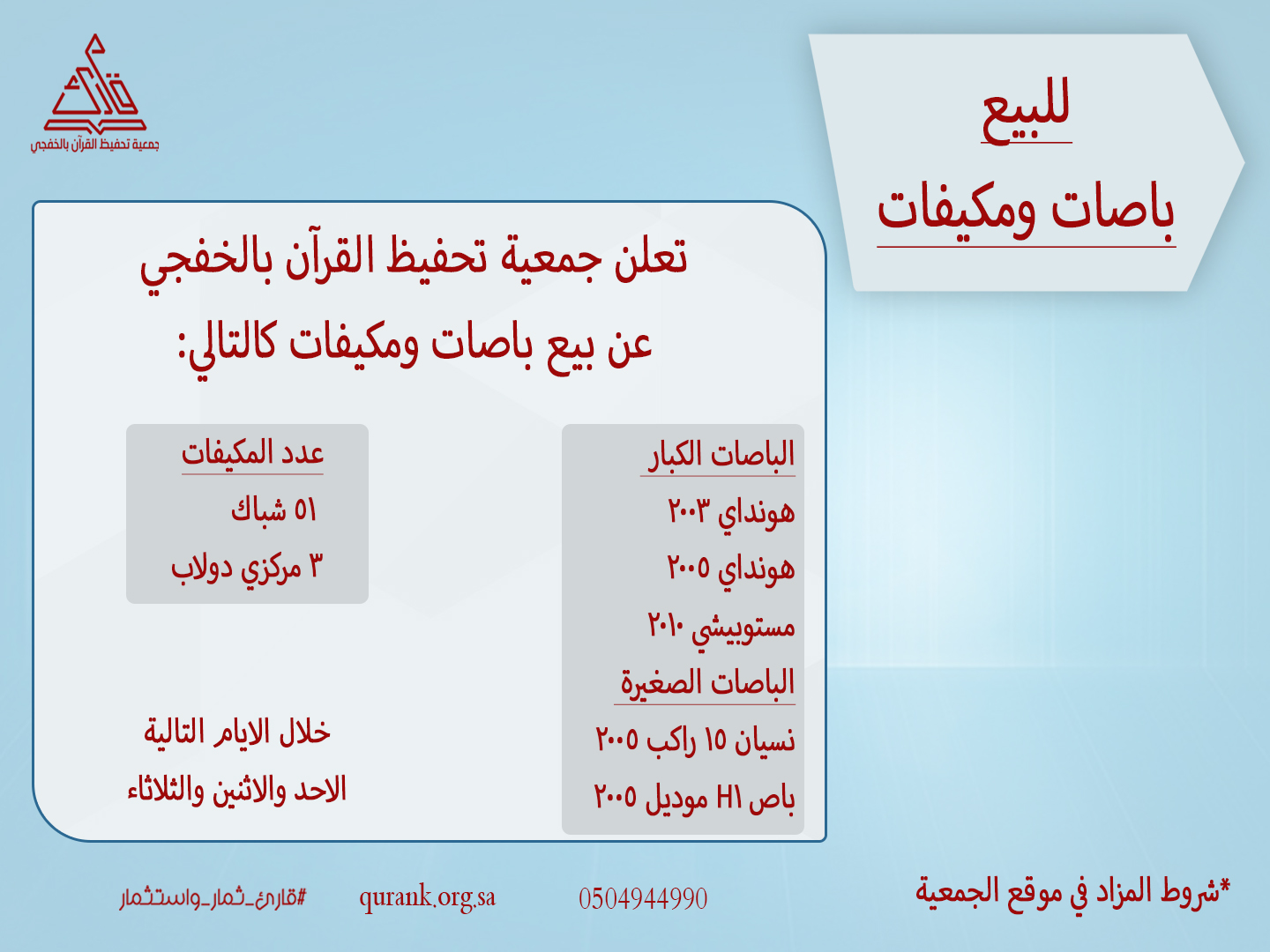 تعلن جمعية قارئ عن بيع باصات ومكيفات كالتالي