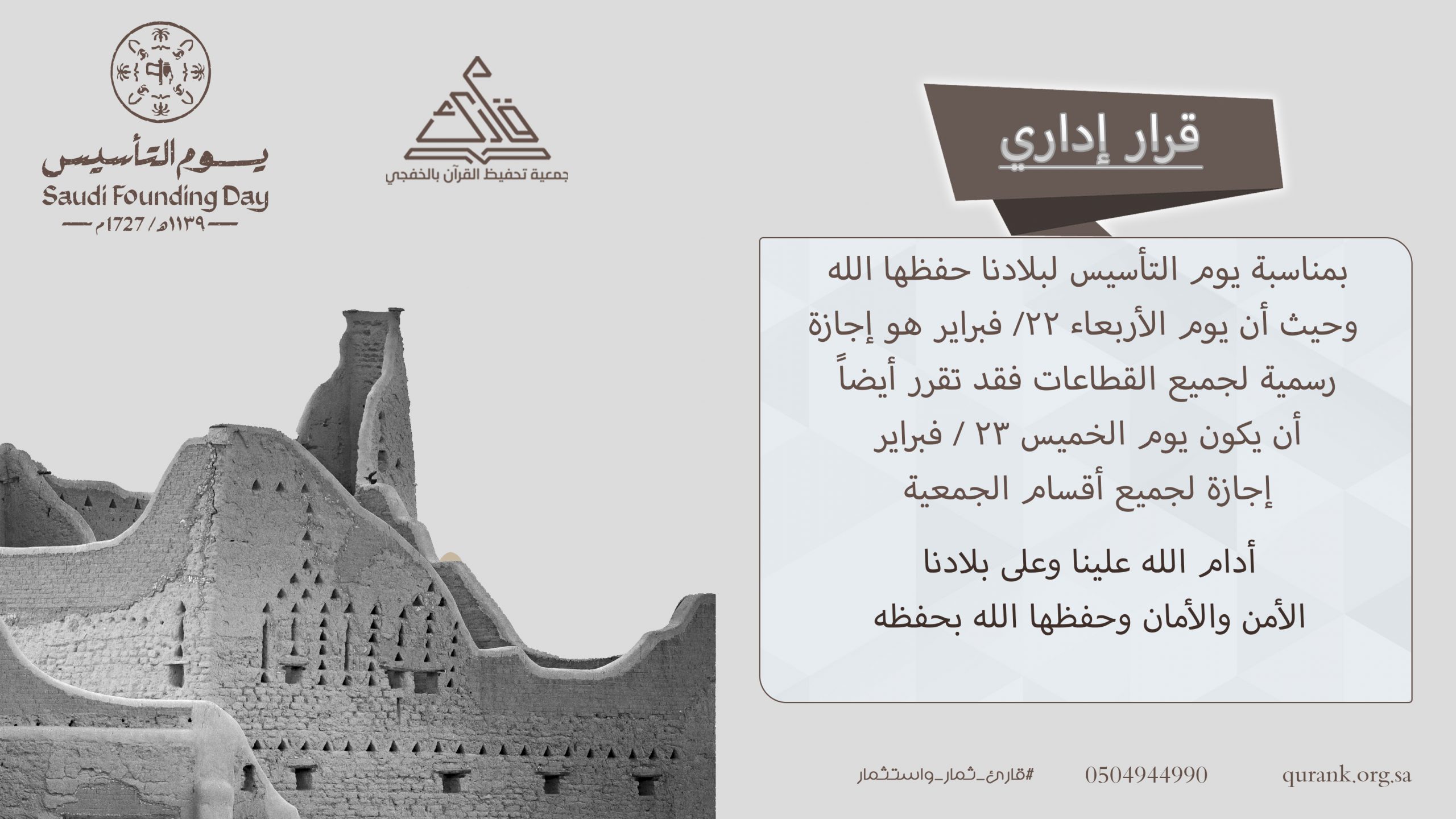 ووفقاً للمادة (128) من اللائحة التنفيذية للموارد البشرية في الخدمة المدنية تم اعتماد الاربعاء والخميس الموافق 22-23/فبراير /2023م اجازة رسمية للاحتفاء بتأسيس الدولة السعودية بأسم “يوم التأسيس: