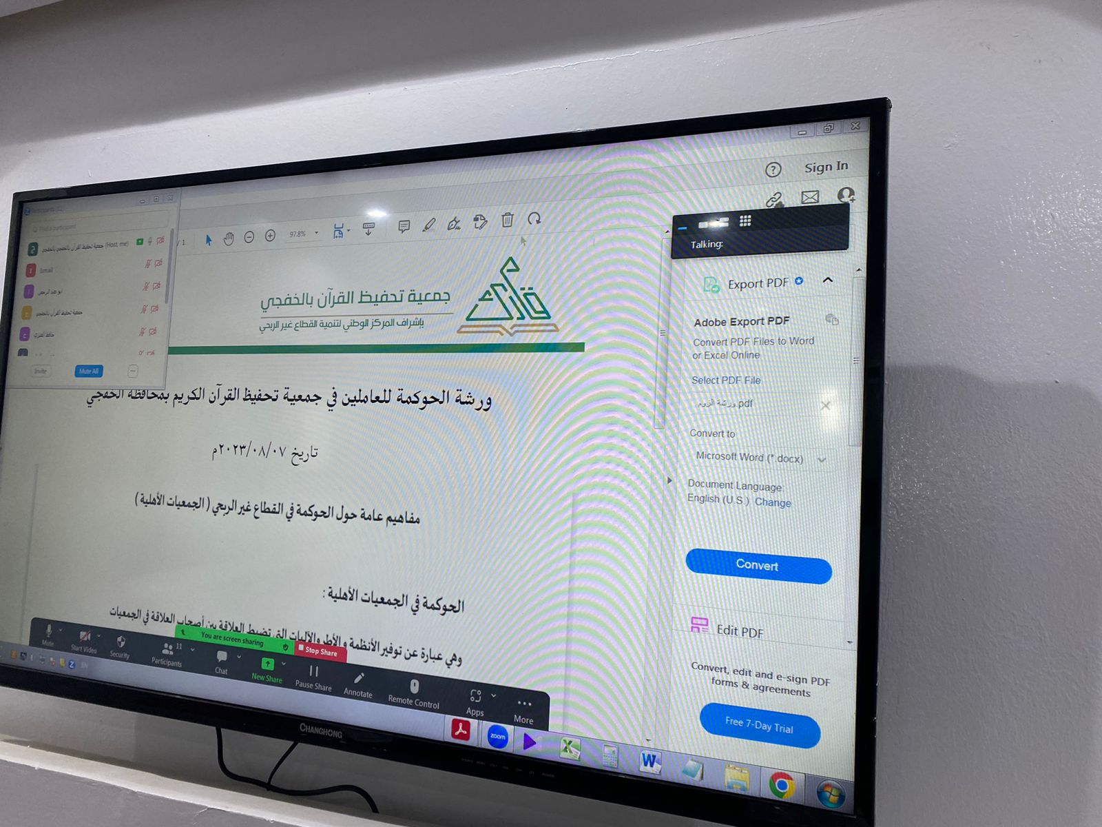 أقامت جمعية تحفيظ القرآن بالخفجي “قارئ” ورشة عمل بعنوان “حوكمة الجمعيات الغير ربحية” يوم الإثنين 08/08/2023م الواحدة ظهرًا، حيث قدمها الأستاذ/ فرحان بن وادي العنزي، وشارك بالحضور منسوبو الجمعية رجالا ونساءً عبر قناة الزوم.