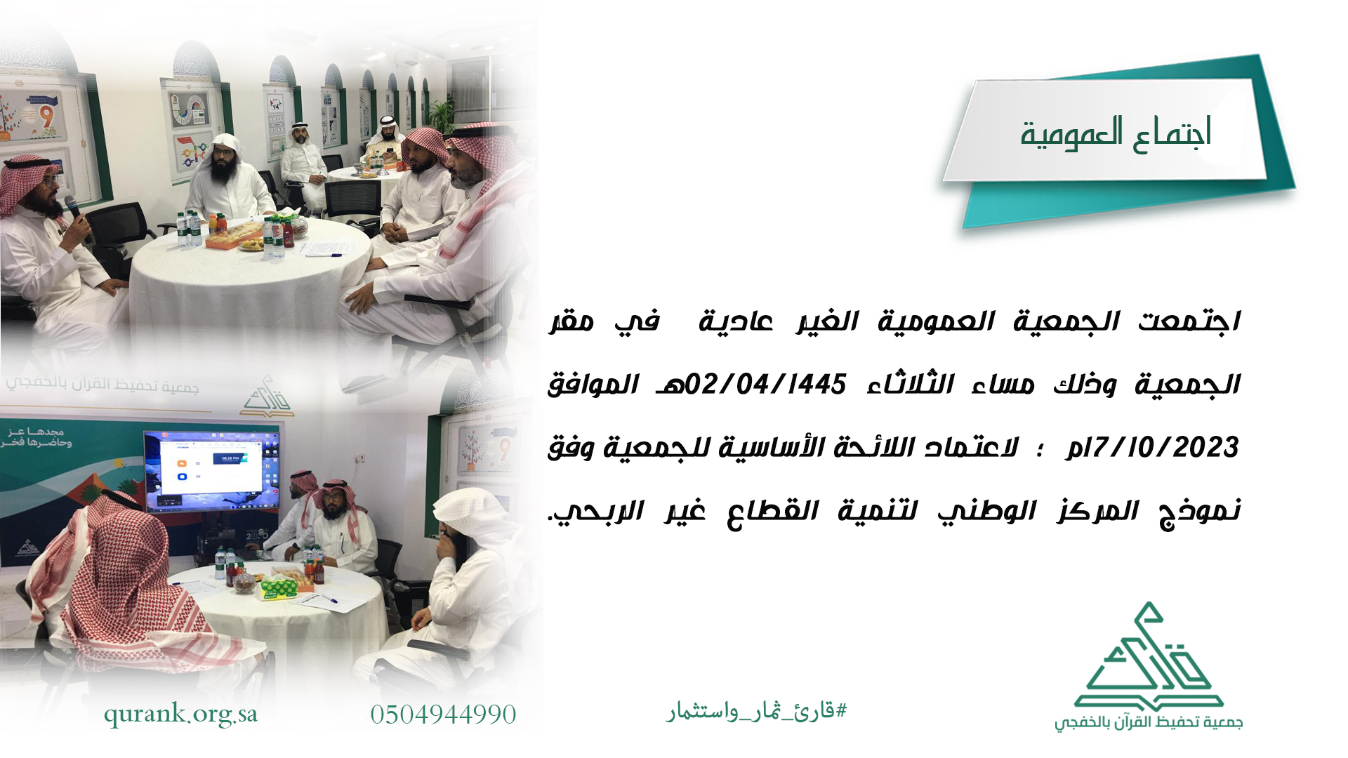 تلبيةً لدعوة مجلس إدارة الجمعية، اجتمعت الجمعية العمومية لاجتماعها الغير عاديّ مساء الثلاثاء 02/04/1445هـ الموافق ا17/10/2023م في مقر الجمعية وذلك لاعتماد اللائحة الأساسية للجمعية وفق نموذج المركز الوطني لتنمية القطاع غير الربحي، وانتهى الاجتماع في تمام الساعة التاسعة والنصف مساءً بعد أن ختمه رئيس مجلس الإدارة بالشكر لله عز وجل على توفيقه، ثم لأعضاء الجمعية العمومية والحضور على حضورهم.