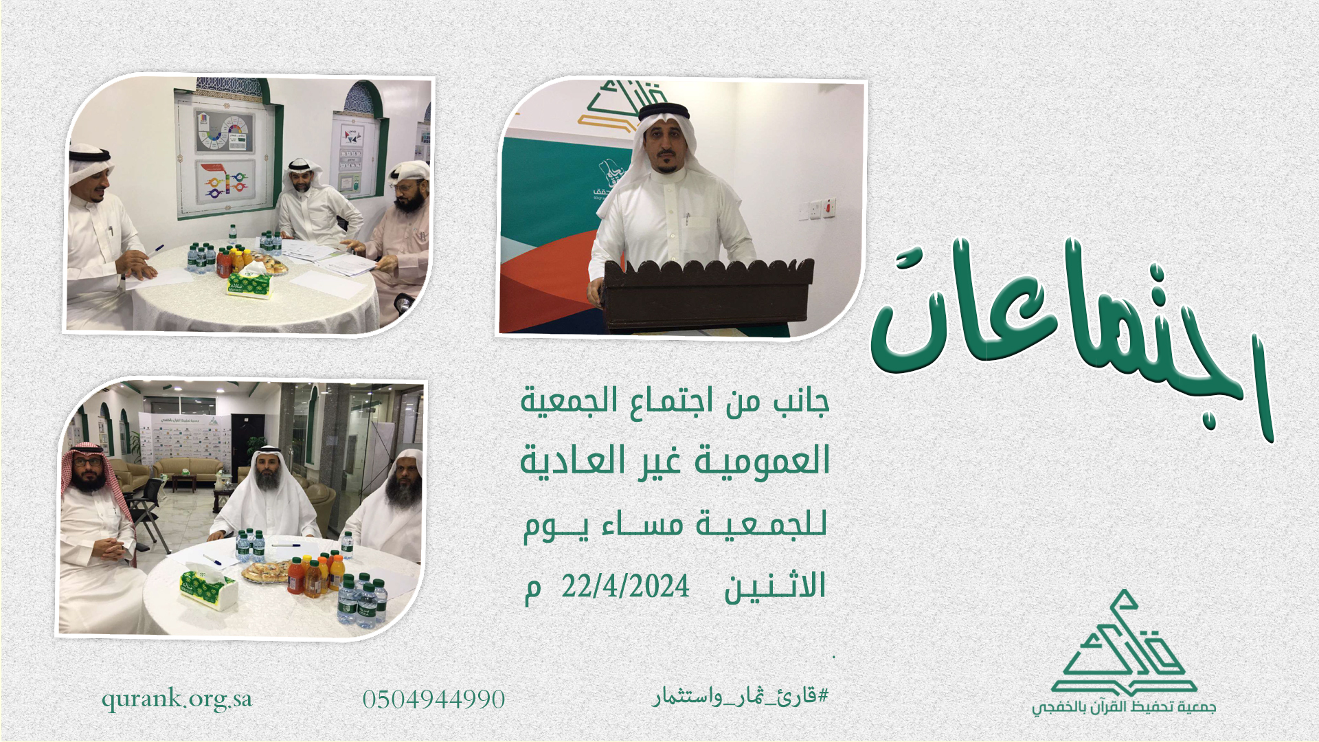 عقدت الجمعية العمومية غير العادية لجمعية تحفيظ القرآن الكريم بالخفجي مساء الاثنين03/10/1445هـ الموافق 22/4/2024م اجتماعها في مقر الجمعية بحضور ممثل وزارة الشؤون الإسلامية والدعوة والإرشاد.، وقد بدأ الاجتماع بكلمة افتتاحية لرئيس مجلس إدارة الجمعية الأستاذ/ عبد العزيز المطيري والتي رحب فيها بالحضور و استعرض خلالها جدول الأعمال، وقد تم خلال الاجتماع اعتماد تعديل أهداف الجمعية باللائحة الأساسية بما يتوافق مع دليل تصنيف الجمعيات المعتمد بوزارة الشؤون الإسلامية والدعوة والإرشاد