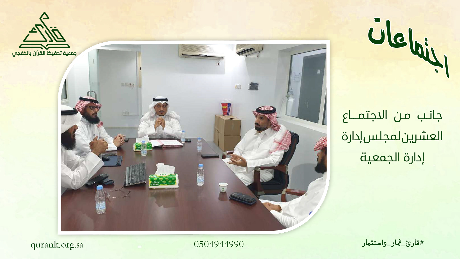 عقد مجلس إدارة جمعية تحفيظ القرآن في الخفجي اجتماعه (20) يوم الاثنين 26 / 11/1445هـ الموافق 03/06/2024م في قاعة الاجتماعات بمقر الجمعية، وبعد اطلاع المجلس على سير الأعمال ومناقشة البنود المدرجة بجدول أعمال الاجتماع قرر: