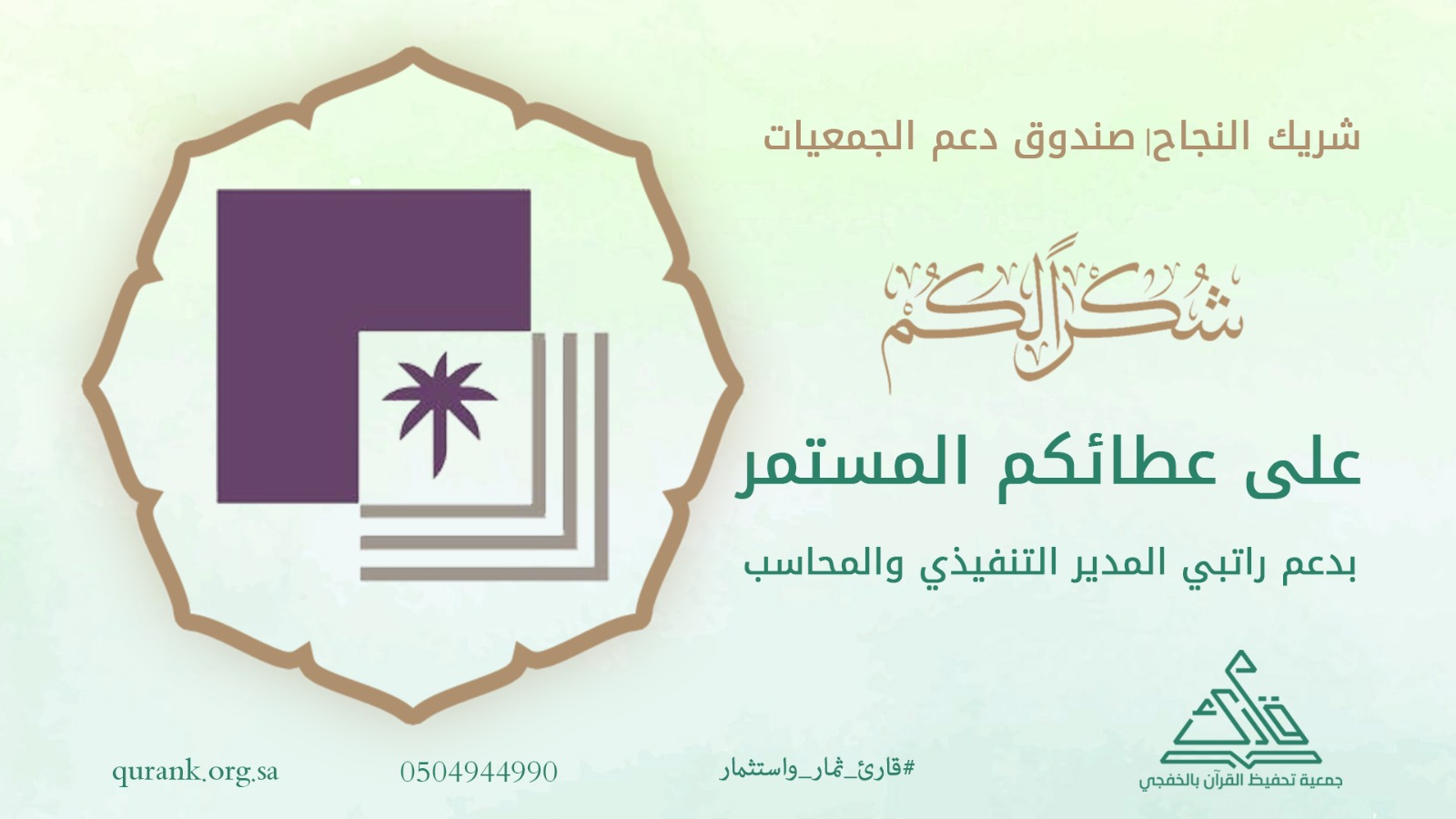 صرح المستشار/ سطام بن قادم الشمري المدير التنفيذي لجمعية تحفيظ القرآن الكريم في الخفجي باستلام منحة دعم رأس المال البشري بقيمة 84100 أربعة وثمانون ألف ومئة ريال من صندوق دعم الجمعيات؛ لدعم راتبي المدير التنفيذي والمحاسب، يوم الخميس 25/05/2023م الموافق 05/11/1444هـ.