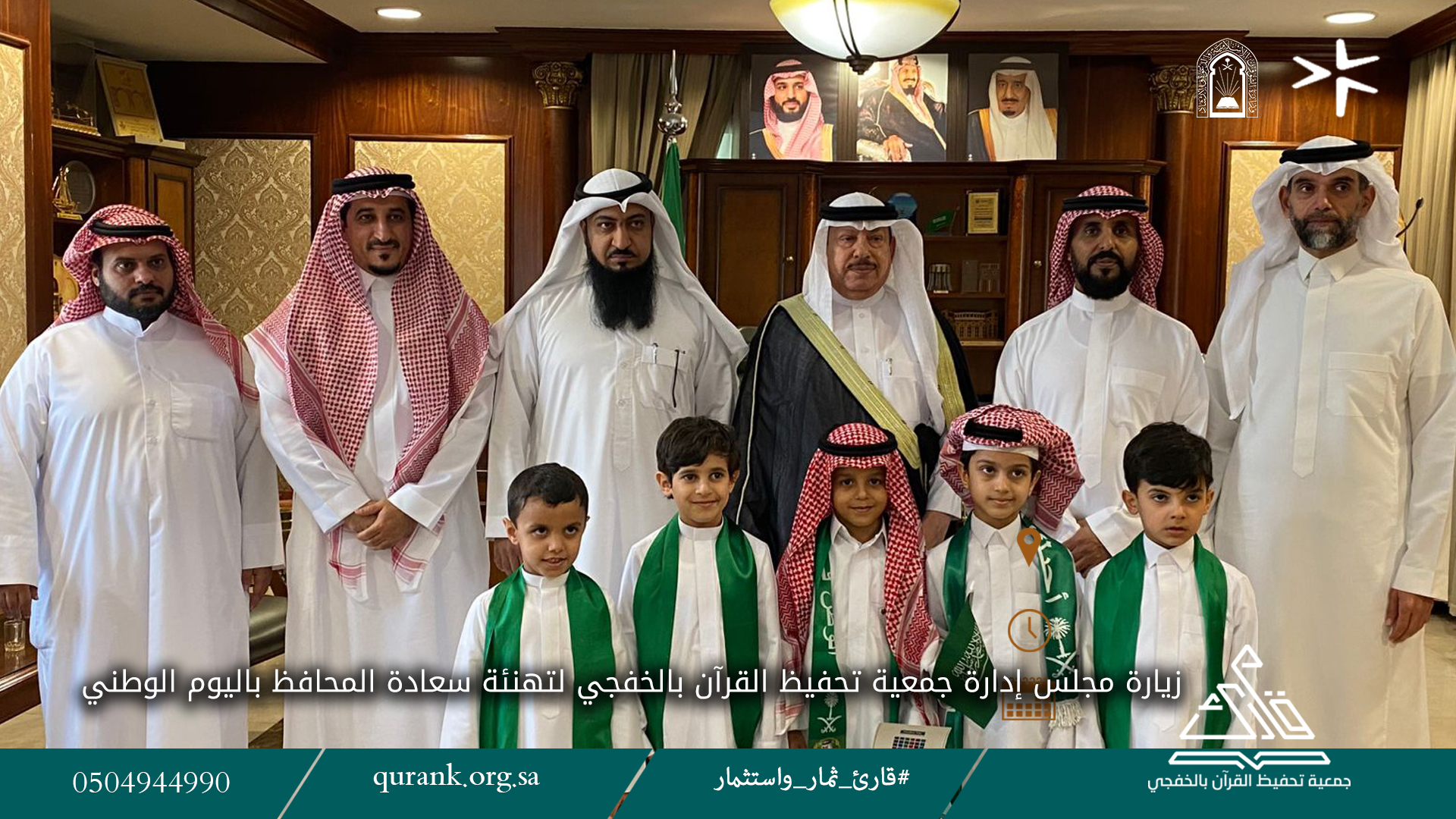 قام مجلس إدارة جمعية تحفيظ القرآن بالخفجي صباح يوم الثلاثاء الموافق 30 سبتمبر 2025م بزيارة سعادة محافظ الخفجي الأستاذ محمد بن سلطان الهزاع، وذلك بمناسبة اليوم الوطني الـ95 للمملكة، حيث قدّم المجلس التهنئة لسعادته بهذه المناسبة الوطنية الغالية، مؤكدين اعتزازهم بما تحقق من إنجازات في ظل القيادة الرشيدة، وقد هنأ سعادة المحافظ رئيس وأعضاء المجلس بمناسبة اعتماده رسميًا من المركز الوطني لتنمية القطاع غير الربحي، وهم: