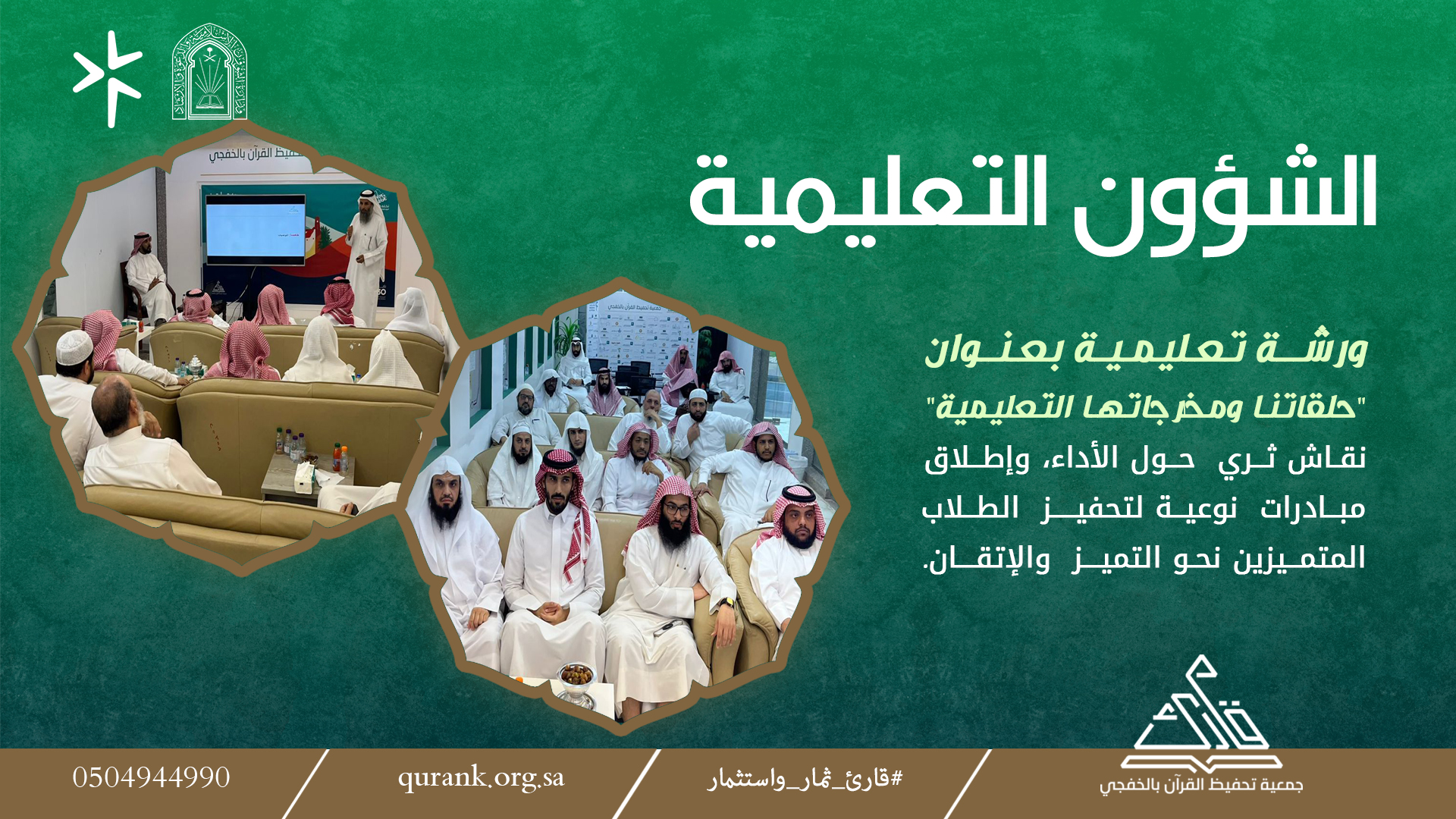بحضور سعادة رئيس مجلس الإدارة الأستاذ محمد بن علي الحربي، عقدت إدارة الشؤون التعليمية بالجمعية ورشة تعليمية بعنوان “حلقاتنا ومخرجاتها التعليمية”، مساء الأربعاء 2025/10/15م في مقر الجمعية وذلك ضمن جهود التطوير المستمر للبرامج التعليمية وتحقيق الأثر النوعي في حلقات التحفيظ.