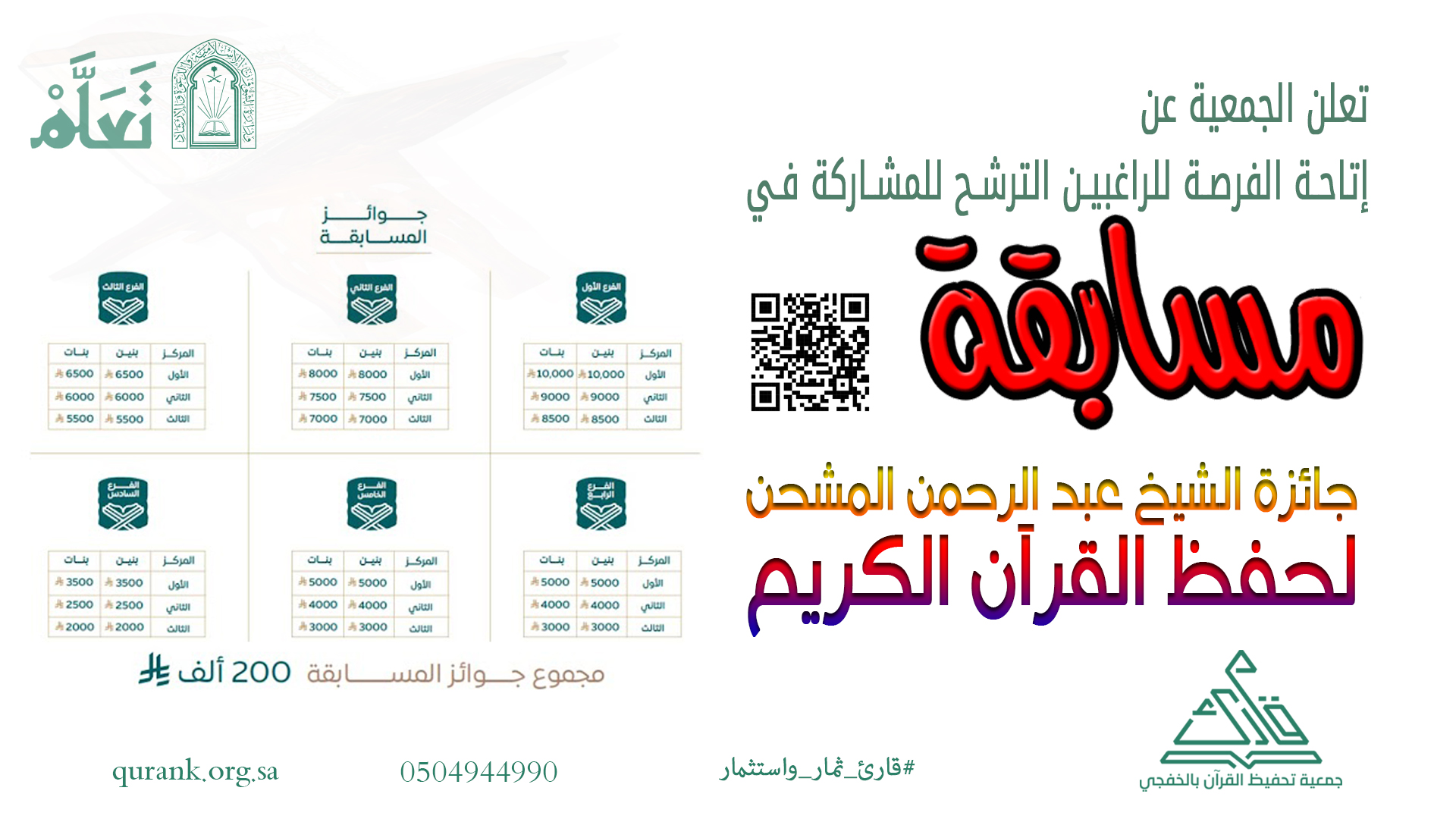دعت جمعية قارئ لتحفيظ القرآن الكريم بالخفجي منسوبيها للمشاركة في مسابقة “تعلّم – جائزة الشيخ عبدالرحمن المشحن – رحمه الله – لحفظ القرآن الكريم وتفسيره”، والتي تُقام بالتعاون مع جمعية (تَعَلَّم) لتعليم القرآن الكريم وعلومه، ضمن جهود الجمعيتين في تعزيز العناية بكتاب الله، وأوضح رئيس مجلس إدارة جمعية قارئ الأستاذ علي بن محمد الحربي أن عناية الدولة بالقرآن الكريم تنطلق من كون هذه البلاد قامت على كتاب الله وسنة نبيه ﷺ، وأن ما يحظى به القرآن الكريم من دعم ورعاية يعكس منهجًا راسخًا في تعظيمه وخدمته وتيسير تعلمه وتعليمه.