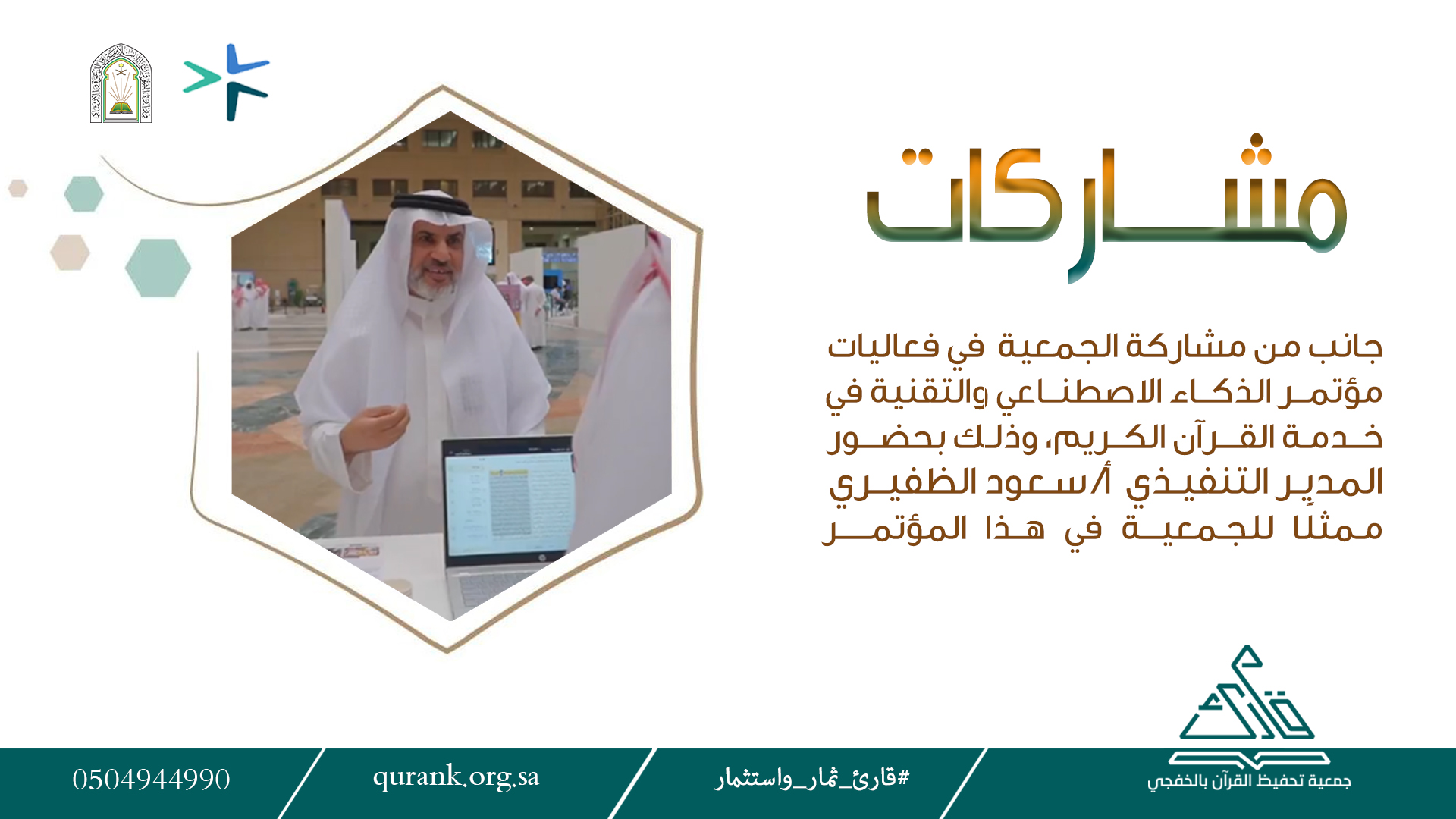 شاركت جمعية تحفيظ القرآن الكريم بمحافظة الخفجي في فعاليات مؤتمر الذكاء الاصطناعي والتقنية في خدمة القرآن الكريم، وذلك بحضور المدير التنفيذي للجمعية الأستاذ/ سعود الظفيري ممثلًا للجمعية في هذا الحدث النوعي الذي يجمع بين التقنية والعلوم الشرعية، وأقيم المؤتمر يوم الأحد 9 ذي القعدة 1447هـ الموافق 26 أبريل 2026م في بهو جامعة الملك سعود، بالشراكة بين جامعة الملك سعود وجمعية مكنون، وبإشراف اللجنة التنسيقية لجمعيات تحفيظ القرآن الكريم بالمملكة.