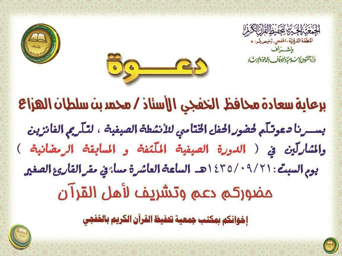 يسر الجمعية الخيرية لتحفيظ القرآن الكريم دعوتكم لحضور الحفل الختامي للانشطة الصيفية وتكريم الفائزين والمشاركين في الدورة الصيفية المكثفة والمسابقة الرمضانية وذلك برعاية محافظ الخفجي الاستاذ/ محمد بن سلطان الهزاع يوم السبت 21/9/1435هـ الساعة العاشرة مساء في مقر القارئ الصغير بجوار الاحوال المدنية .