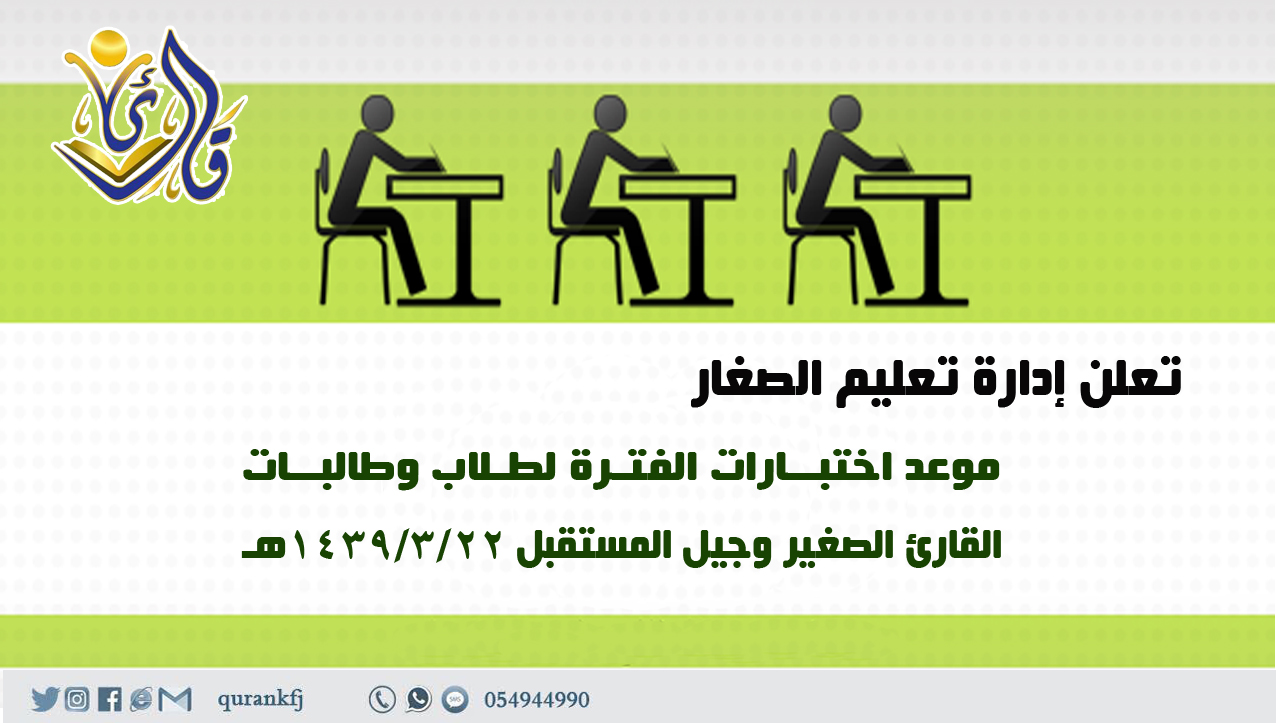 أعلنت إدارة تعليم الصغار بجمعية قارئ عن موعد بداية اختبارات الفصل الدراسي الأول للعام الدراسي 1438- 1439هـ، لعموم طلاب وطالبات القارئ الصغير وجيل المستقبل في جميع المراحل الدراسية، وذلك يوم الأحد الموافق 22/3/1439 هـ